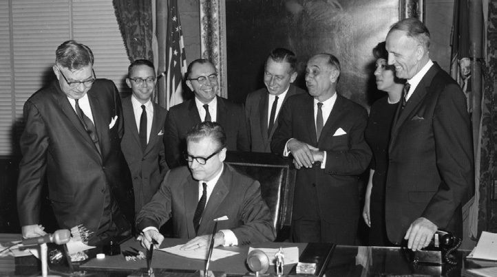 Photo: Gov. Nelson A. Rockefeller, seated, signs the Public Employees Fair Employment Act, known as the Taylor Law, in 1967. From left to right, then CSEA President Joseph Feily; Rockefeller aide and former CSEA counsel Harry Albright; state Budget Director T. Norman Hurd; Lt. Gov. Malcolm Wilson; Attorney General Louis Lefkowitz; Ersa Poston, chair of the state Civil Service Commission, unidentified woman and incoming CSEA President Theodore Wenzl. Photo courtesy of New York State Archives.